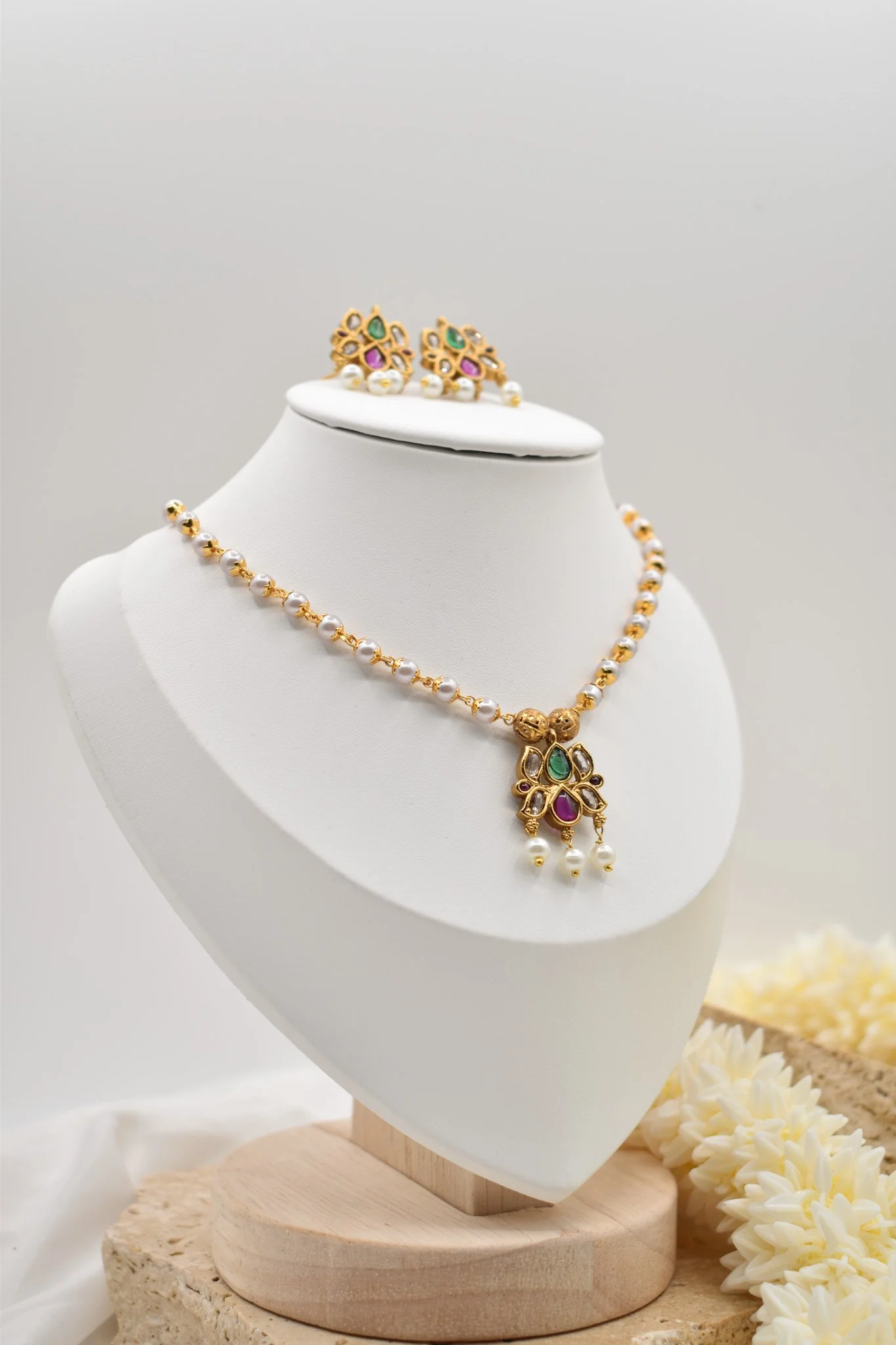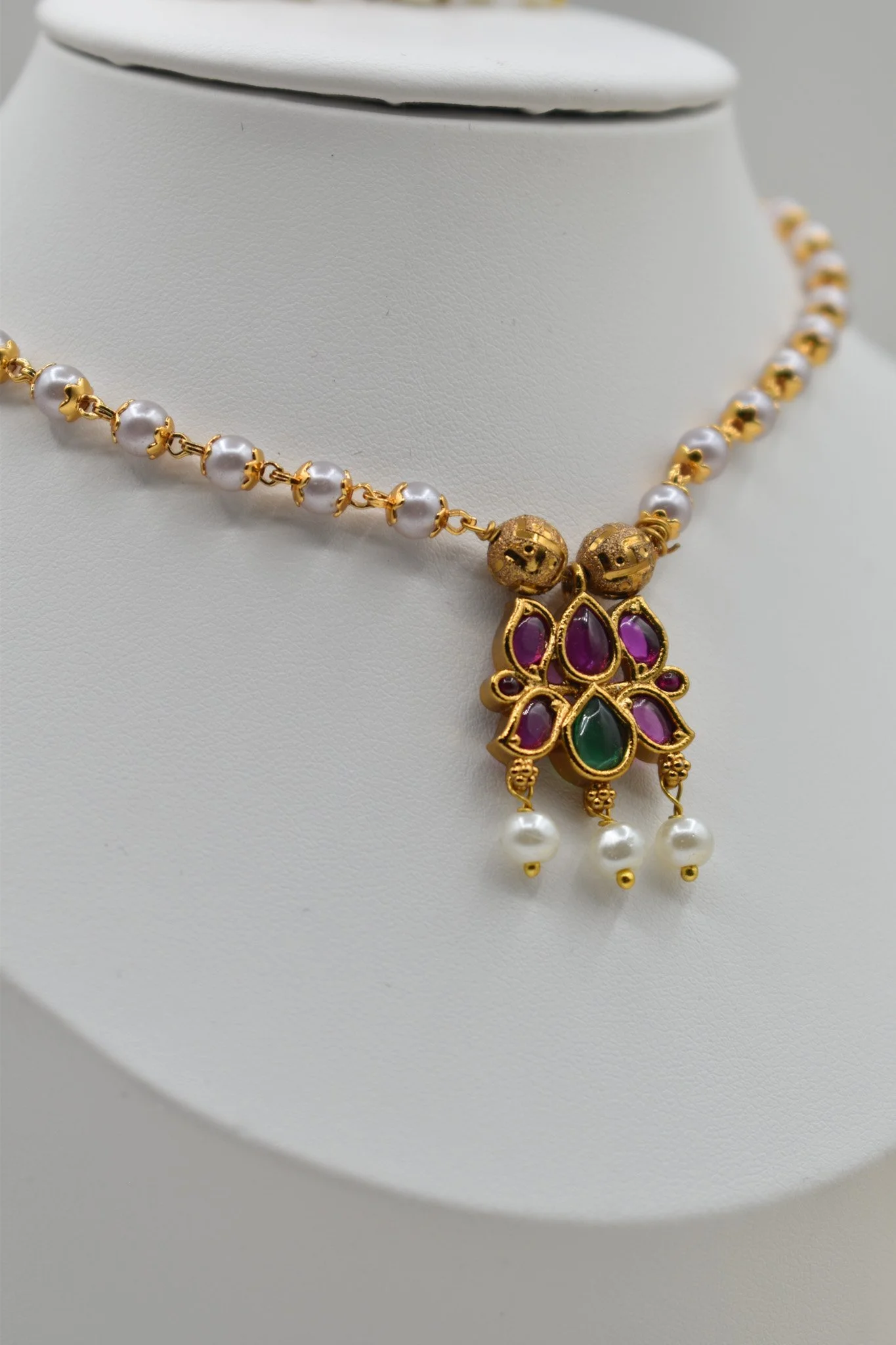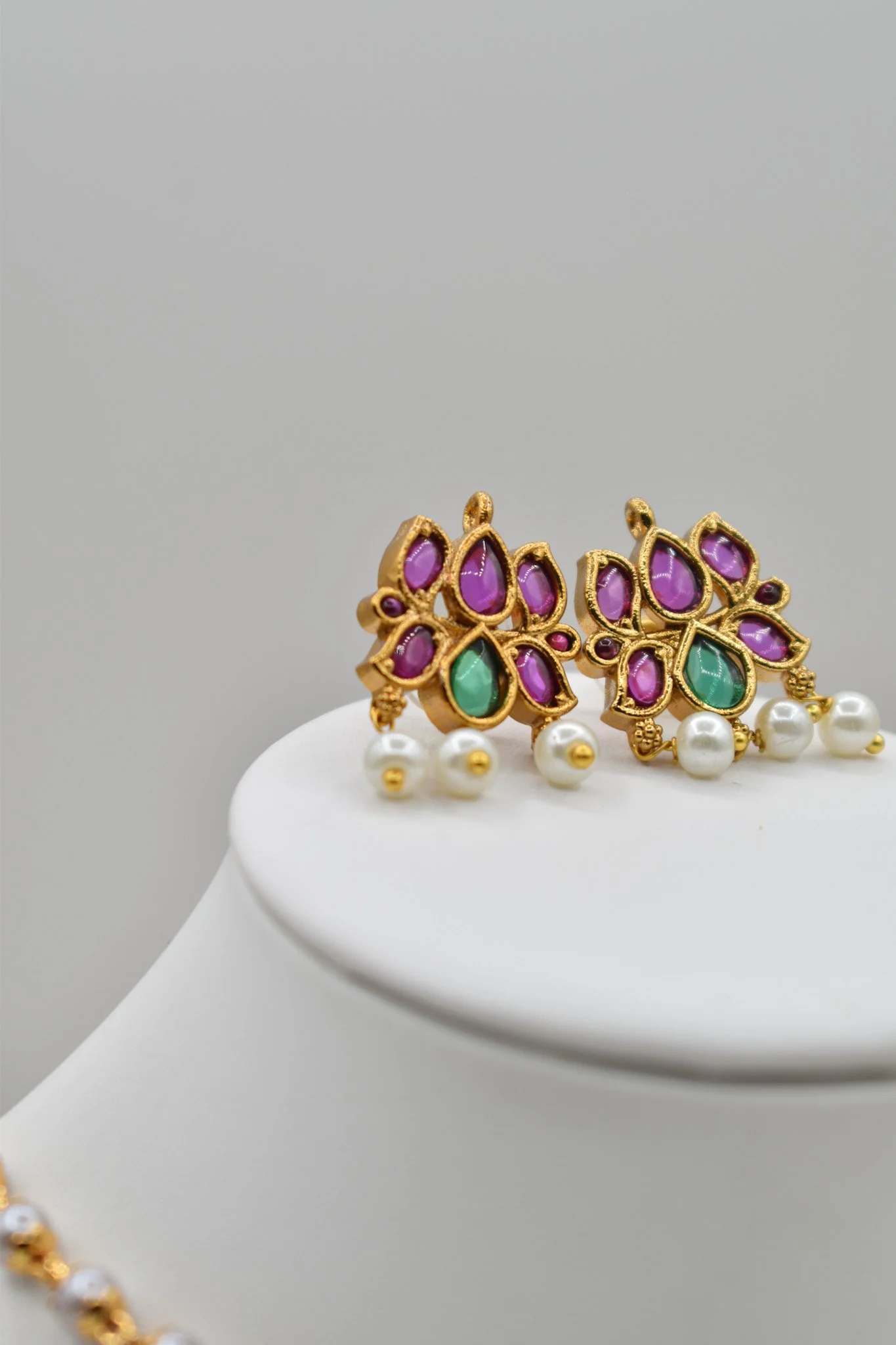 a traditional gold-toned necklace set adorned with colorful gemstones and pearl accents, designed for an elegant and festive look.