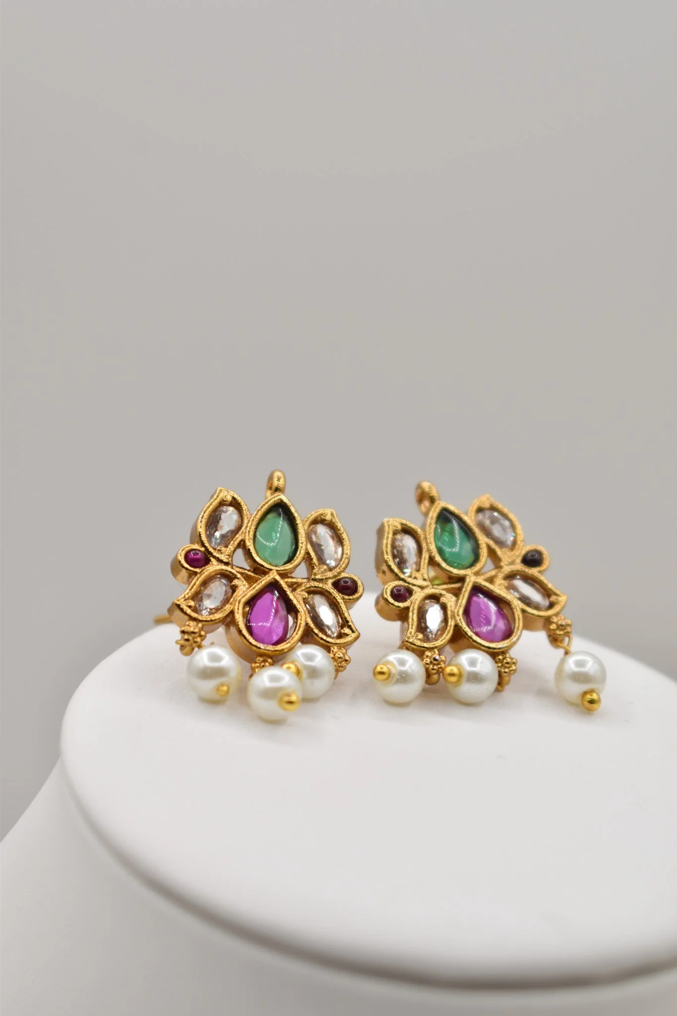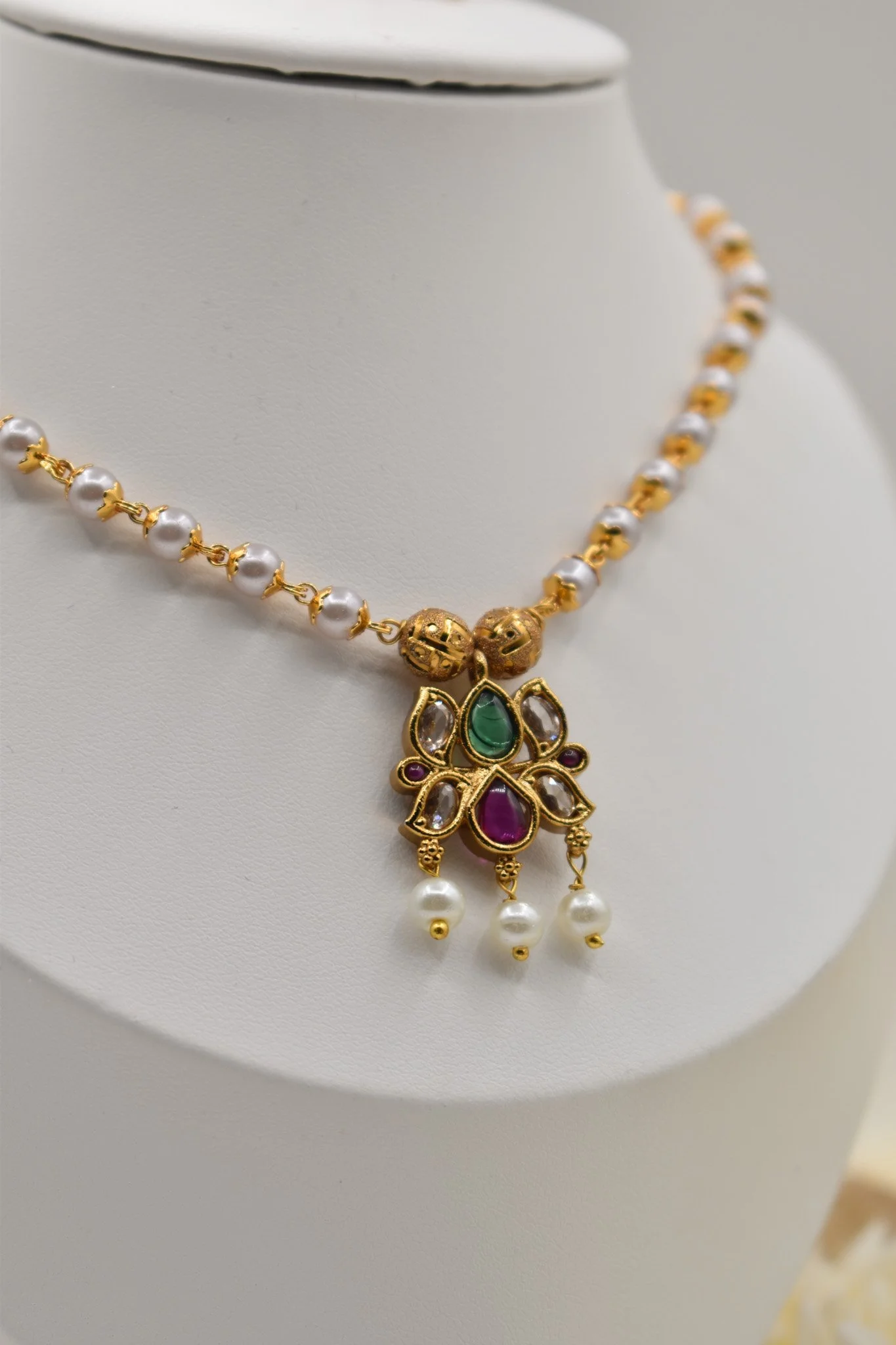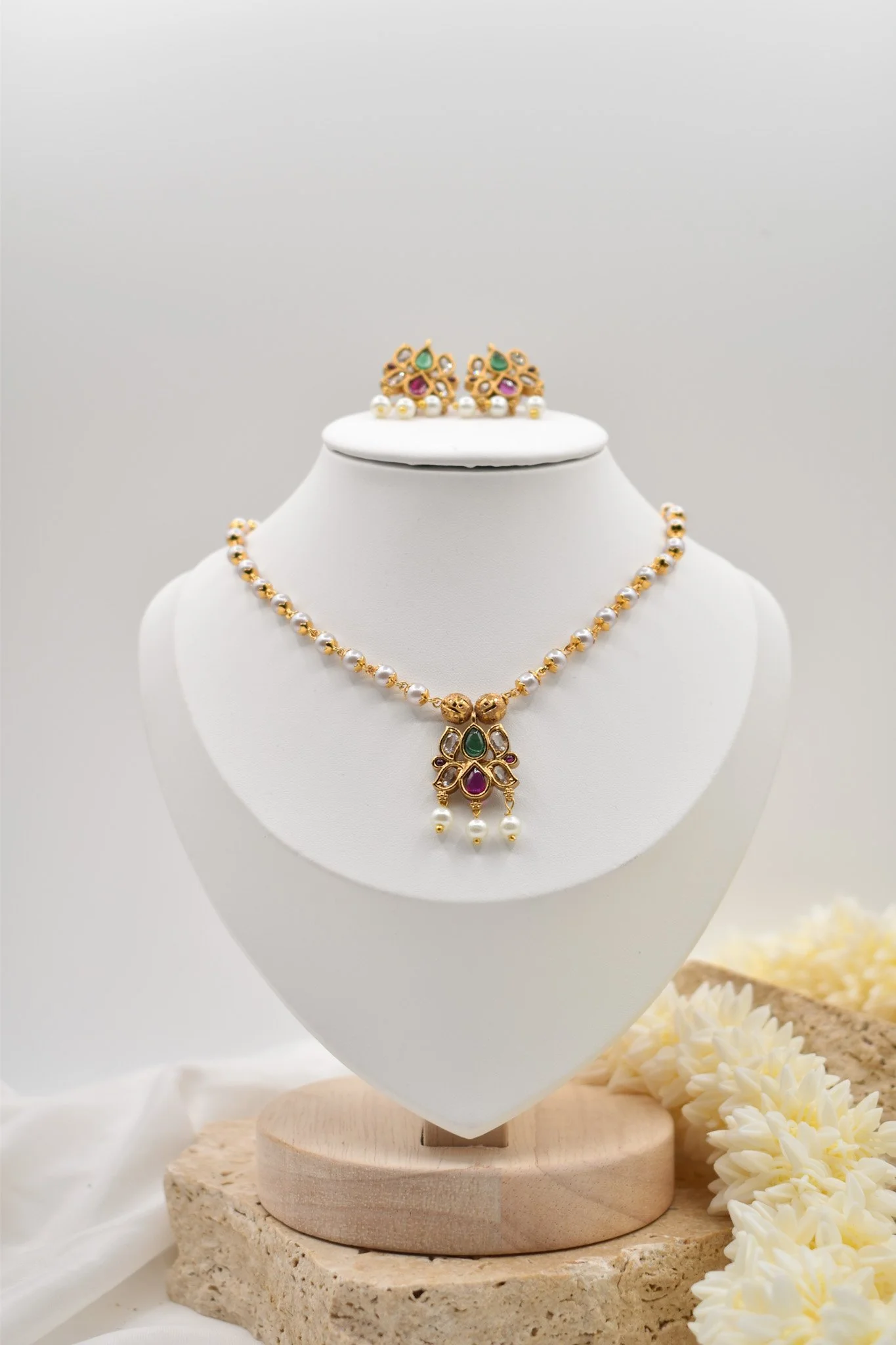 a traditional gold-toned necklace set adorned with colorful gemstones and pearl accents, designed for an elegant and festive look.