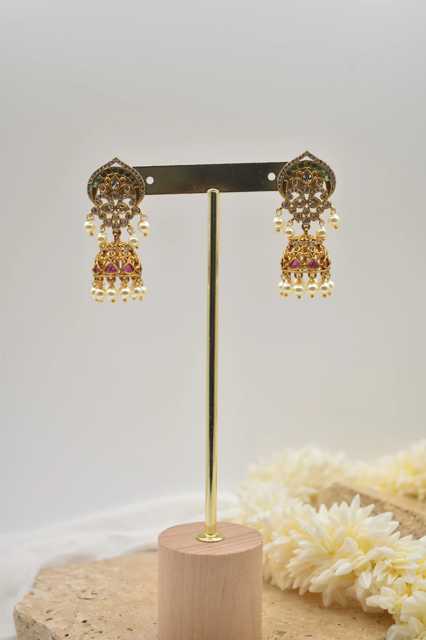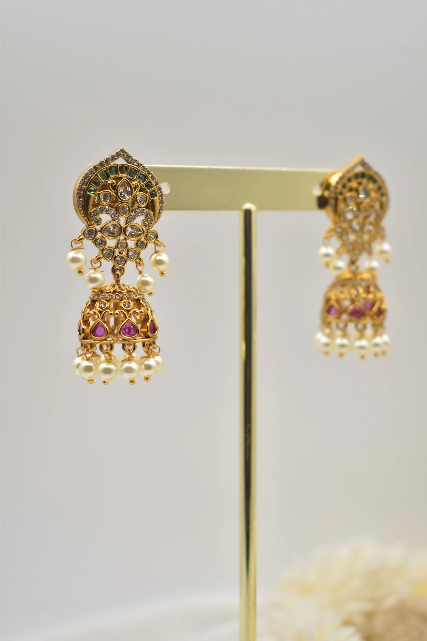 Stunning jhumka earrings feature a vibrant combination of green and pink stones set in an intricate gold-toned design, finished with delicate pearl drops for a classic traditional charm.